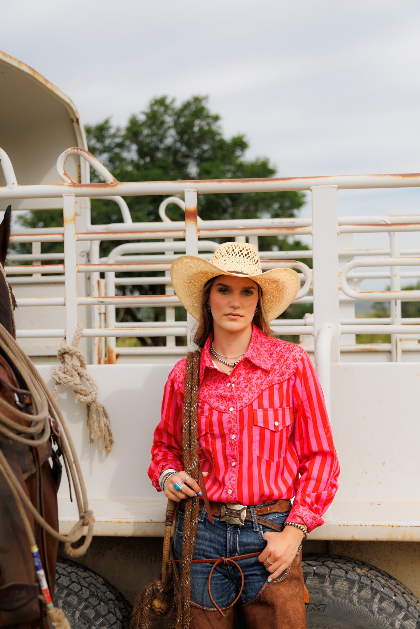 We're obsessed with this pairing—florals meet stripes in a way that just works. Whether you're heading to the barn or the arena, this pearl snap delivers the versatility and style you're after.